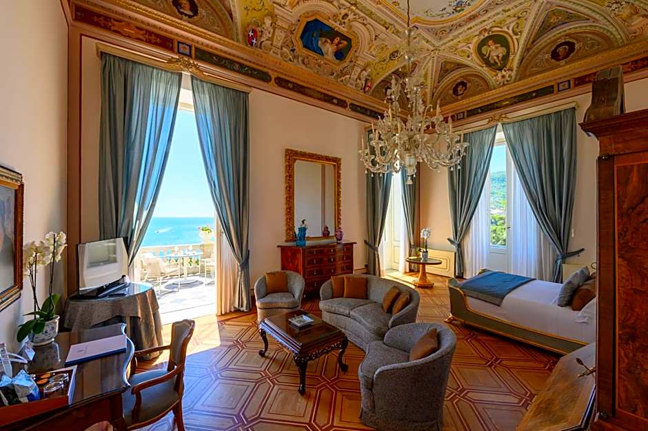 This elegant room with balcony offers a small seating area, a view of the Ligurian Sea, and a Murano glass chandelier.
